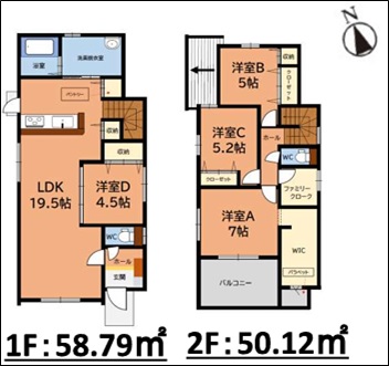 LDK19.5畳 1階 洋室4.5畳 1階 洋室7畳 2階 洋室5.2畳 2階 洋室5畳 2階 |