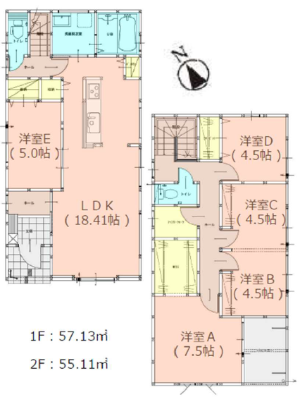 LDK18.4畳 1階 洋室5畳 1階 洋室7.5畳 2階 洋室4.5畳 2階 洋室4.5畳 2階 洋室4.5畳 2階 |